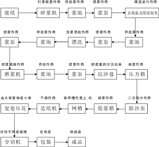 由廢紙進(jìn)入水力碎漿機(jī),水力碎漿機(jī)對(duì)廢紙進(jìn)行作打漿脫墨,打漿脫墨后的紙漿流入漿池;由提漿泵把紙漿從漿池提入高頻振動(dòng)篩,高頻振動(dòng)篩起到篩選雜物分離作用;篩選后到流入漿池,再由漿泵提入漂洗機(jī),作用是洗漿干凈,漂白;漂白后自動(dòng)流入漿池;再由漿提入磨漿機(jī),經(jīng)磨漿磨成細(xì)漿后,自動(dòng)流入漿池再由漿泵提入沉沙盤,沉沙盤的作用是將沙灰等雜質(zhì)沉淀分離出去,后制成純漿,再由除沙泵提入穩(wěn)漿箱,穩(wěn)漿箱作用是調(diào)和漿的濃度,之后自動(dòng)流入網(wǎng)槽后,由網(wǎng)籠毛毯帶漿進(jìn)入烘缸。(烘缸是起烘干作用)后進(jìn)入成品卷紙。卷紙后進(jìn)入復(fù)卷機(jī),復(fù)卷的作用是起復(fù)卷打孔壓花作用。由大卷復(fù)卷成小卷,后進(jìn)入分切機(jī),分切機(jī)的作用是起分切,不同規(guī)格長短作用,后經(jīng)包裝到成品。注:鍋爐是起到熱氣的作用,送入烘缸起到干燥紙的作用。
